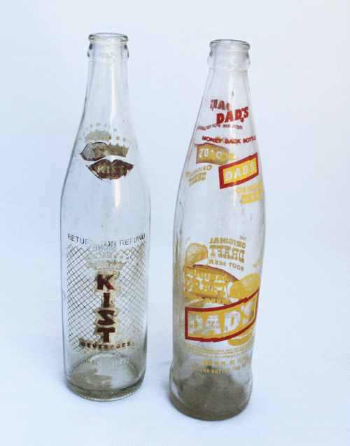 Found a couple of old soda bottles from a man who had dug these out of a drained lake bed. The are old and dirty but I thought the Dad's Rootbeer bottle would be great for a Father's Day display and the KIST bottle could be used for a Valentine's display.