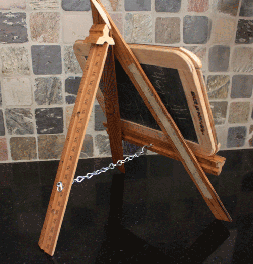 The easel was made with three more rulers as the legs and an architect's ruler as the tray that supports the slate chalkboard.